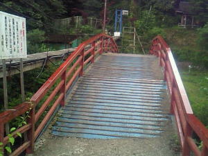 裏から外に出て、鉄の橋を渡った所にあります。