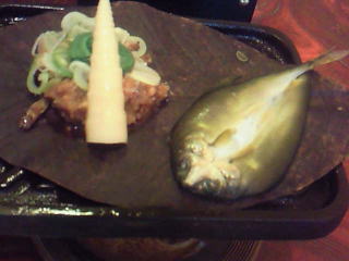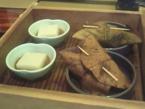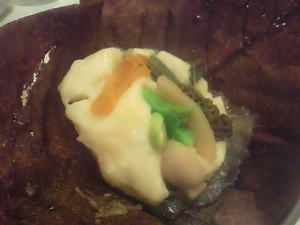 ゴマ豆腐の味噌あえと、じゃがいもと野菜類を蒸して、ほうばで包んだものがありました。