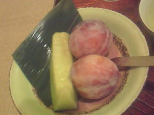 さっぱりしてうまいですねー。ご飯はまぜごはんで、味噌汁と一緒に食べました。 この時、お腹いっぱいで、お代わりが二杯しかできなかったのが残念です。 最後にデザートですが、プラム2つ、メロンでした。 プラムは、柔らかくて甘くておいしかったですねー。そのあとのメロンが、また甘くていいですねー。 |